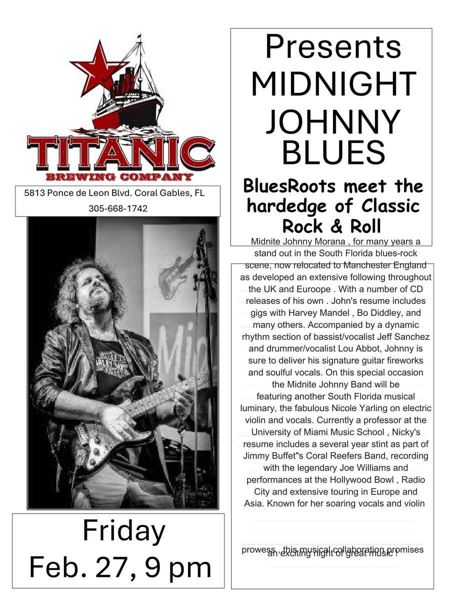 Midnite Johnny Morana , for many years a standout in the South Florida blues-rock scene, now relocated to Manchester England, has developed an extensive following throughout the UK and Europe . With many CD releases of his own . John's resume includes gigs with Harvey Mandel , Bo Diddley, and many others. Accompanied by a dynamic rhythm section of bassist/vocalist Jeff Sanchez and drummer/vocalist Lou Abbot, Johnny is sure to deliver his signature guitar fireworks and soulful vocals. On this special occasion the Midnite Johnny Band will be featuring another South Florida musical luminary, the fabulous Nicole Yarling on electric violin and vocals. Currently a professor at the University of Miami Music School , Nicky's resume includes a several-year stint as part of Jimmy Buffet"s Coral Reefers Band, recording with the legendary Joe Williams and performances at the Hollywood Bowl , Radio City and extensive touring in Europe and Asia. Known for her soaring vocals and violin prowess , this musical collaboration promises an exciting night of great music !