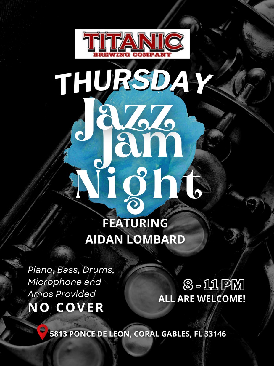 Thursday nights sound better with jazz 🎷✨ Join us for Jazz Jam Night at Titanic Brewing Company, featuring Aidan Lombard and live musicians.